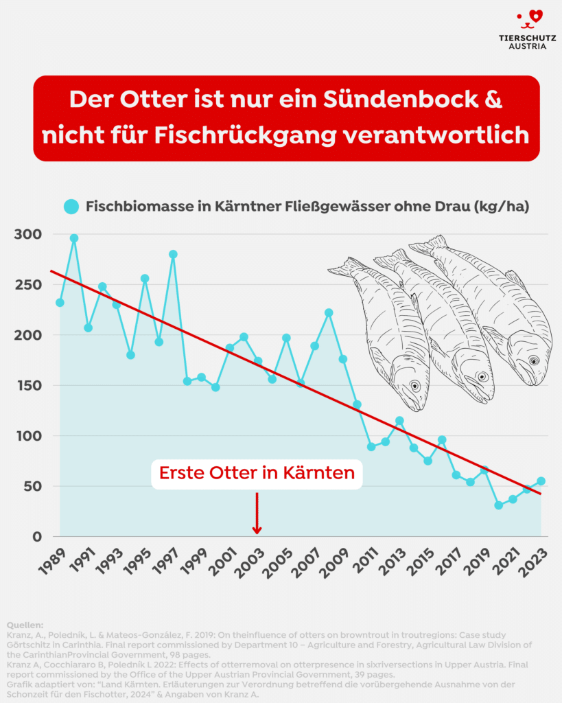 Dabei zeigen diese Daten eindeutig, dass sich die durchschnittliche Fischbiomasse zwischen 1990 und 1999 fast halbierte – zu einem Zeitpunkt, als Fischotter in Kärnten noch ausgerottet waren. Der erste Otter wurde erst wieder 2003 in Kärnten nachgewiesen, frühestens 2005 nahm die natürliche Wiederbesiedelung durch einzelne Tiere aus Slowenien langsam zu.