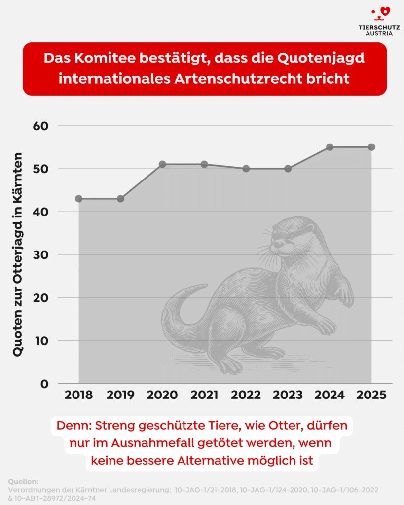 Auf der 45. Tagung des Standing Committee der Berner Artenschutzkonvention stellte das internationale Komitee jetzt eindeutig fest, dass die Kärntner Fischotterverordnung gegen zentrale Vorgaben des internationalen Artenschutzrechts verstößt. Besonders beanstandet wurden pauschale Abschussquoten ohne verpflichtende Einzelfallprüfung sowie der Einsatz nicht selektiver und grausamer Fangmethoden wie Conibearfallen, die nach der Berner Artenschutzkonvention ausdrücklich verboten sind.