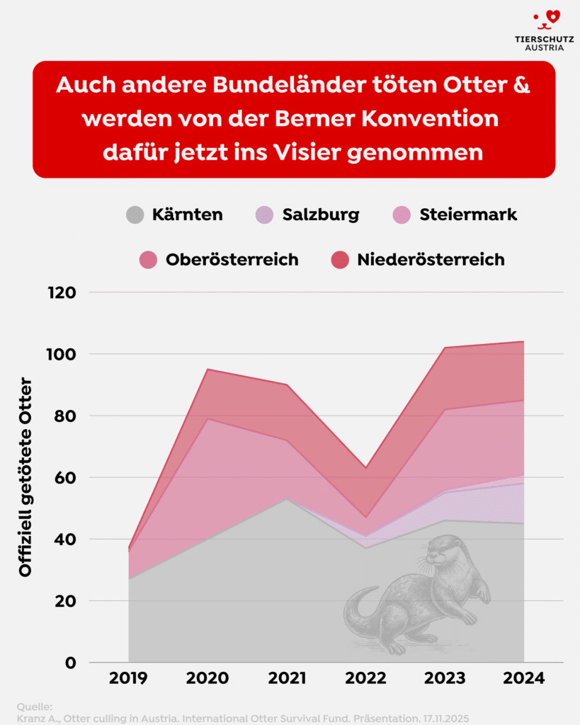 Zwischen 2019 und 2024 wurden in Kärnten offiziell 226 streng geschützte Fischotter getötet. Diese Zahl bildet jedoch nur einen Teil der Realität ab. Viele Tiere werden nicht erfasst, etwa weil sie verletzt ins Wasser flüchten oder weil nach dem Abschuss säugender Weibchen deren Jungtiere qualvoll verhungern. Diese Todesfälle werden nicht in die Zahl der offiziell gemeldeten Todesfälle eingerechnet.