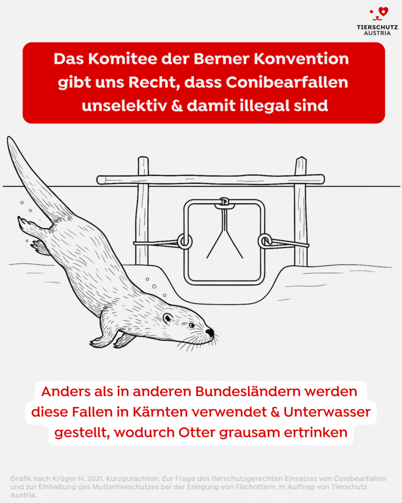 Kärnten tötet Otter nicht nur durch die Flinte, sondern auch mit sogenannten Conibearfallen. Diese Totschlagfallen töten nicht selektiv und können massives Leid verursachen, etwa durch Ertrinken, Ersticken, Unterkühlung oder schwere innere Verletzungen. In allen anderen österreichischen Bundesländern sowie in Deutschland sind sie deshalb aus gutem Grund verboten.