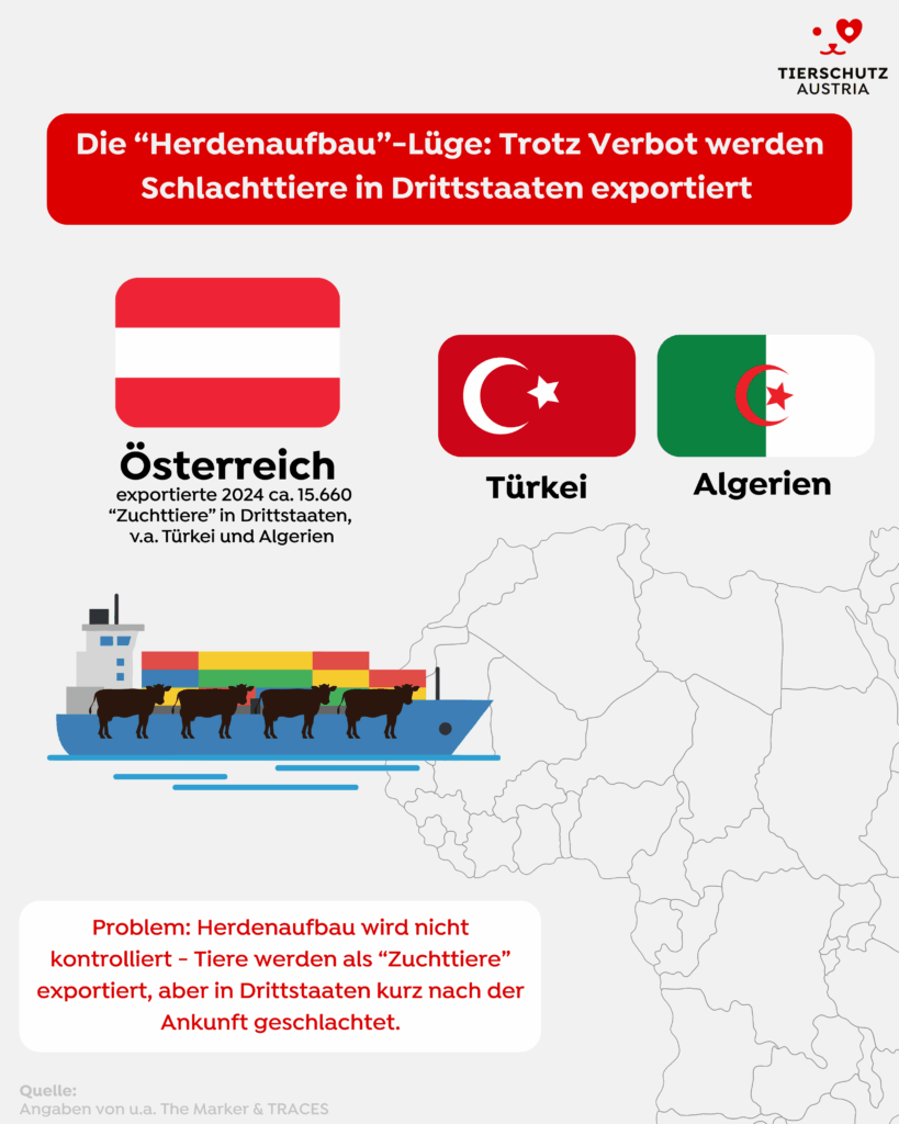 Österreich hat sich selbst zum Vorreiter erklärt, als es den Export von Schlachttieren in Drittstaaten verboten hat. Doch leider blieb ein Schlupfloch: Der Export für den sogenannten Herdenaufbau. 2024 hat Österreich 15.660 „Zuchttiere“ exportiert – die meisten davon in die Türkei und nach Algerien, wo keine vergleichbaren Tierwohlstandards gelten.