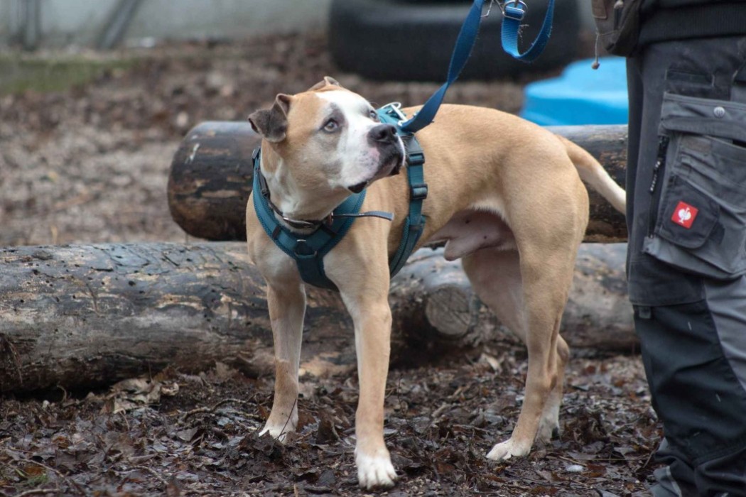 Der stattliche, 2022 geborene American Staffordshire Terrier-Rüde Tyson ist menschenfreundlich und kann auch zu Teenagern vermittelt werden. Bei Social Walks zeigt sich Tyson auch bei Direktkontakt hundefreundlich. Freies Spiel ist leider nicht möglich – hierzu haben wir leider keinen passenden Hund für sein Temperament, daher können wir hier keine Aussagen machen. Kleine Hunde mag Tyson jedoch nicht! Da Tyson einen kleinen Hund totgebissen hat, ist bei kleinen Hunden große Vorsicht geboten und Tyson sollte bei Spaziergängen ausnahmslos seinen Maulkorb tragen. Tyson kennt das Brustgeschirr, geht brav an der Leine, trägt auch brav seinen Maulkorb und ist stubenrein. Der liebe, stattliche Kerl kann überall hin ziehen – er ist stadttauglich.